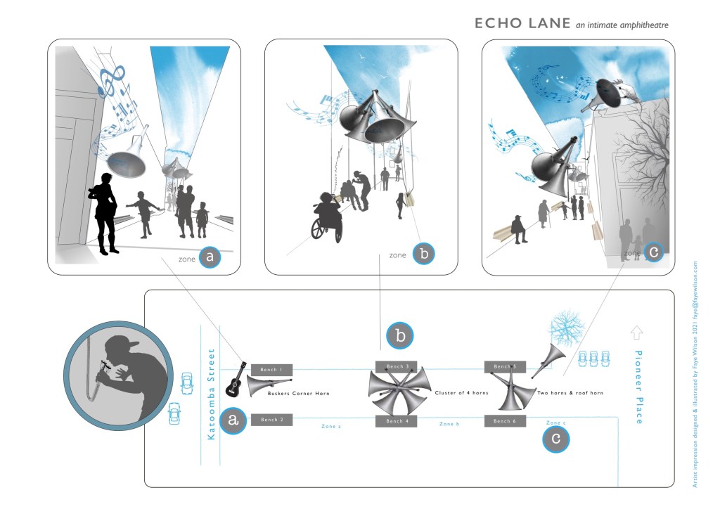I have been commissioned to create a large acoustic artwork in Davies Lane Katoomba. The work titled Echo Lane aims to create an intimate amphitheatre in this busy laneway which opens onto Katoomba’s main shopping street.